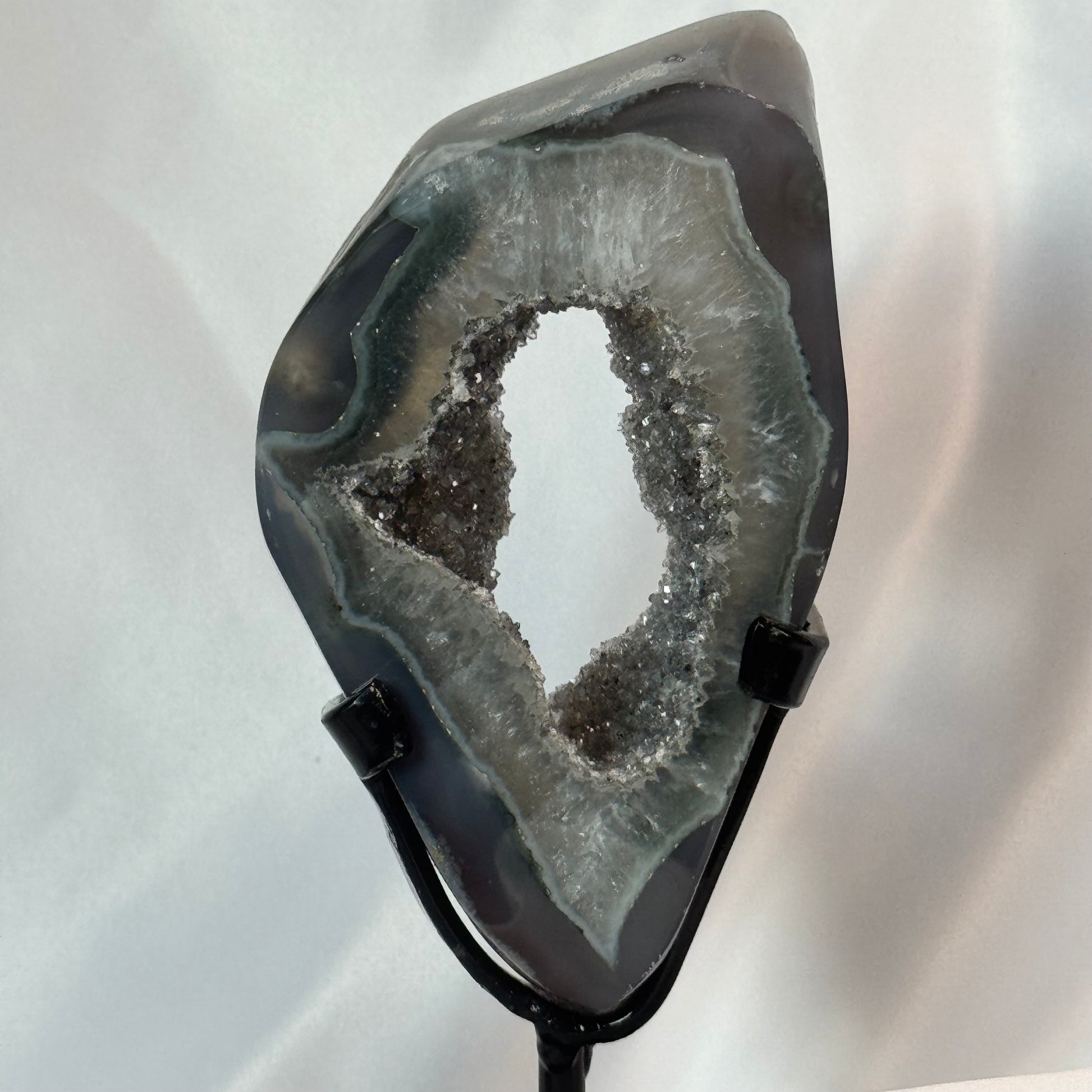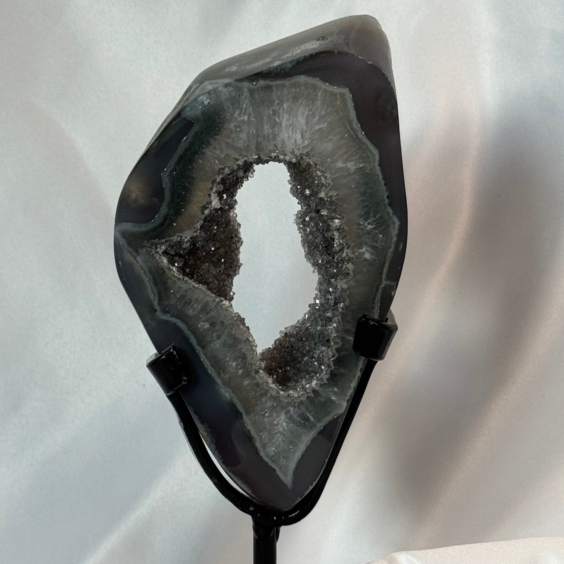 Natural Grey Amethyst Polished Freeform on a custom stand. Weighs: 15.85 ounces and stands 7.5 inches with stand. Full of sugary druzy.