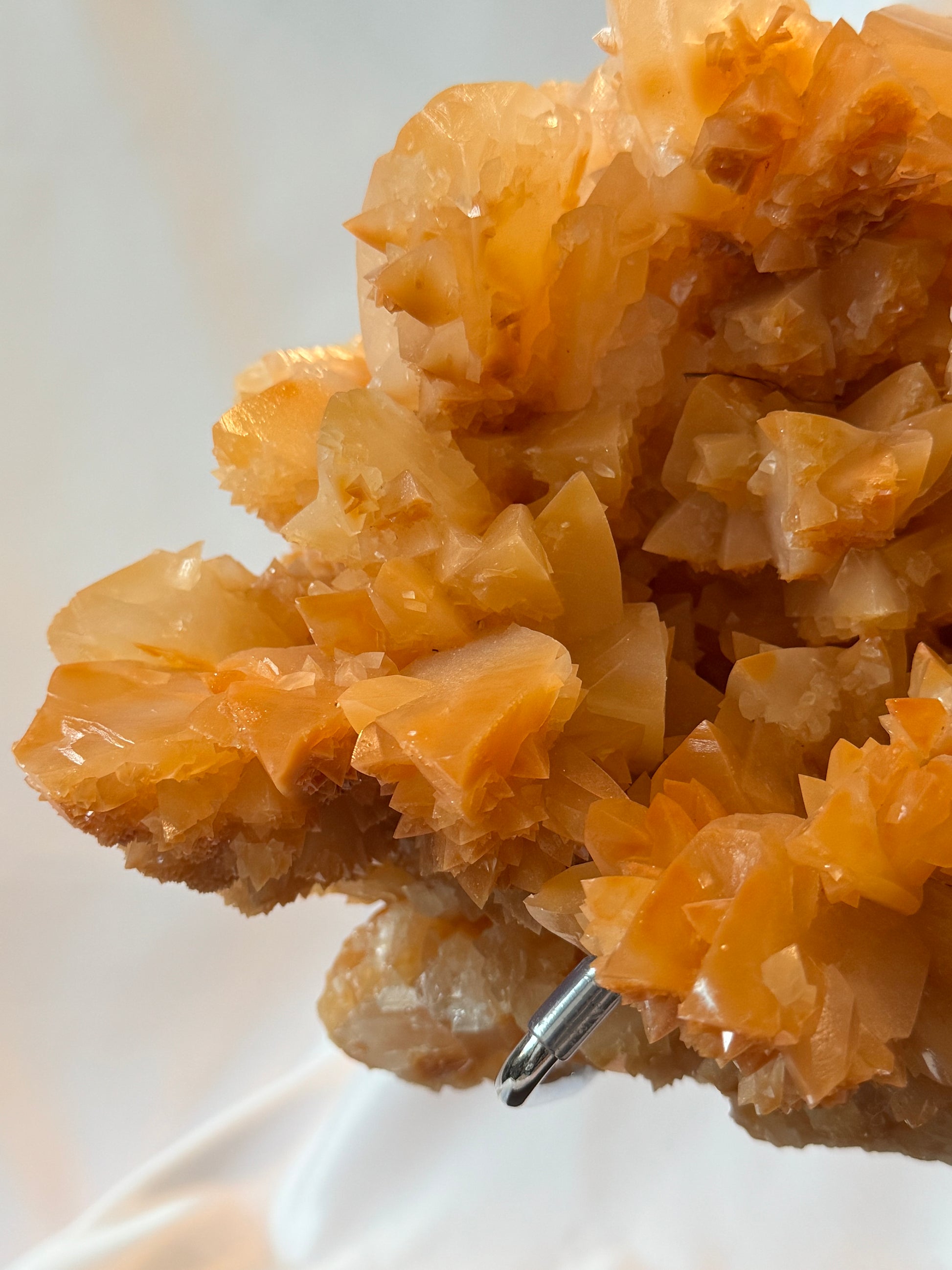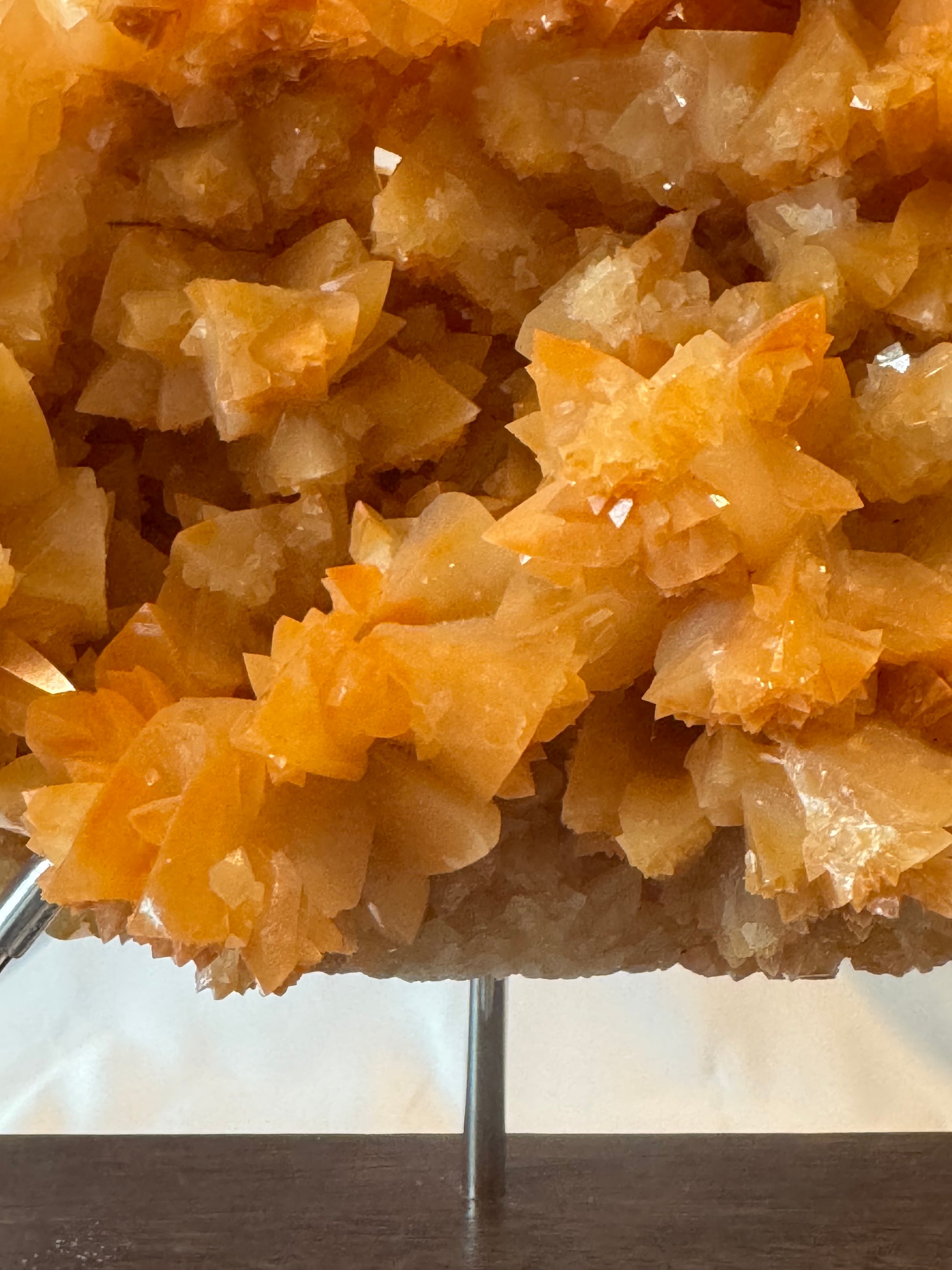 This Orange Crystalline Cluster hails from the roof of a cave in Miramar and stands as a striking statement piece for any collection. Weighing 9.94 pounds, it commands attention with its vibrant orange hue and brilliant crystal formation, inviting admiration from every angle.